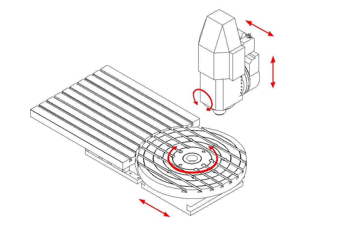 Maskinen har en vertikal konfigurasjon med to lineære akser som beveger verktøyet og én som beveger bordet. Denne utformingen gir optimal vektfordeling, redusert vibrasjon og høyere dynamisk presisjon. Den integrerte tiltbare hodet gir tilgang til komplekse vinkler og gjør det mulig å utføre avansert flerakse maskinering med høy nøyaktighet.